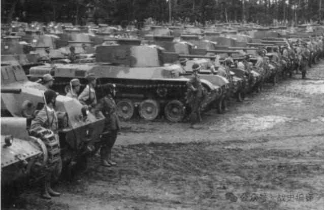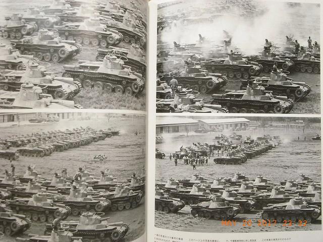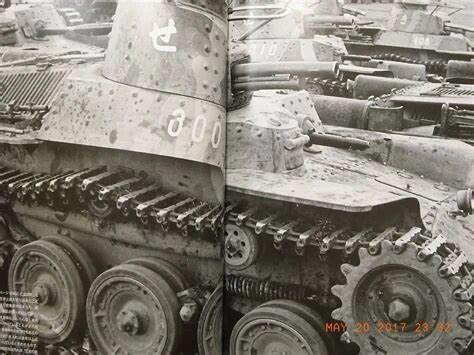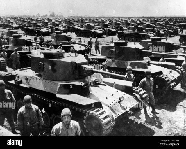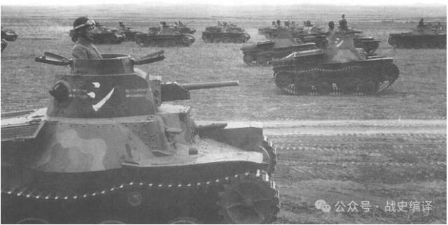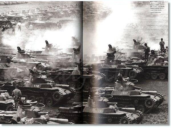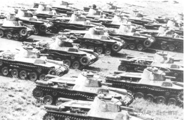 图 17. 投降时刻的战车第 4 师团,前排大多数是一式中战车,特征是与九七式中战车类似的 47 毫米战车炮、焊接而非铆接的装甲板,以及平直的车体前挡板,后排是经典的九五式轻战车,靠近镜头处的一辆是全履带式的一式装甲运兵车,从装备和训练上来说,这支装甲部队堪称旧日本陆军的装备巅峰