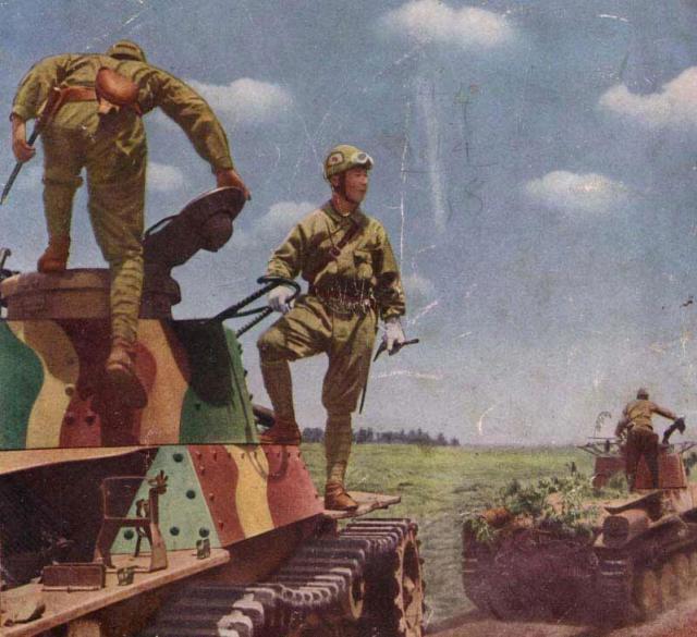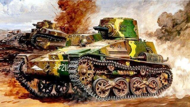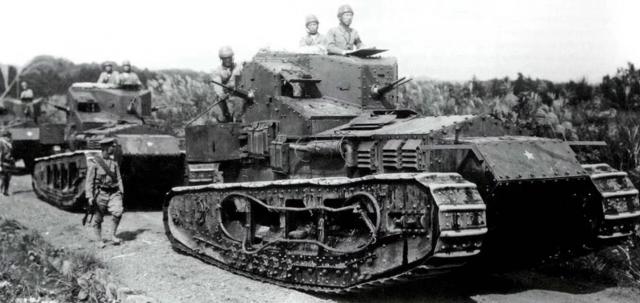 图 20. 在侵华战场上曾经耀武扬威的日军战车,照片已经上色,可见两辆均为日军九七式中战车,战车兵携带军刀和俗称"王八盒子"的配枪