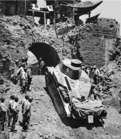 图 18. 准备驶入一处中国城市城墙的八九式中战车,炮塔左后方有一个樱花状的标识,这是战车第 1 大队(原久留米战车第 1 联队改称,并于 1938 年 7 月改编为战车第 7 联队)第 3 中队的标识